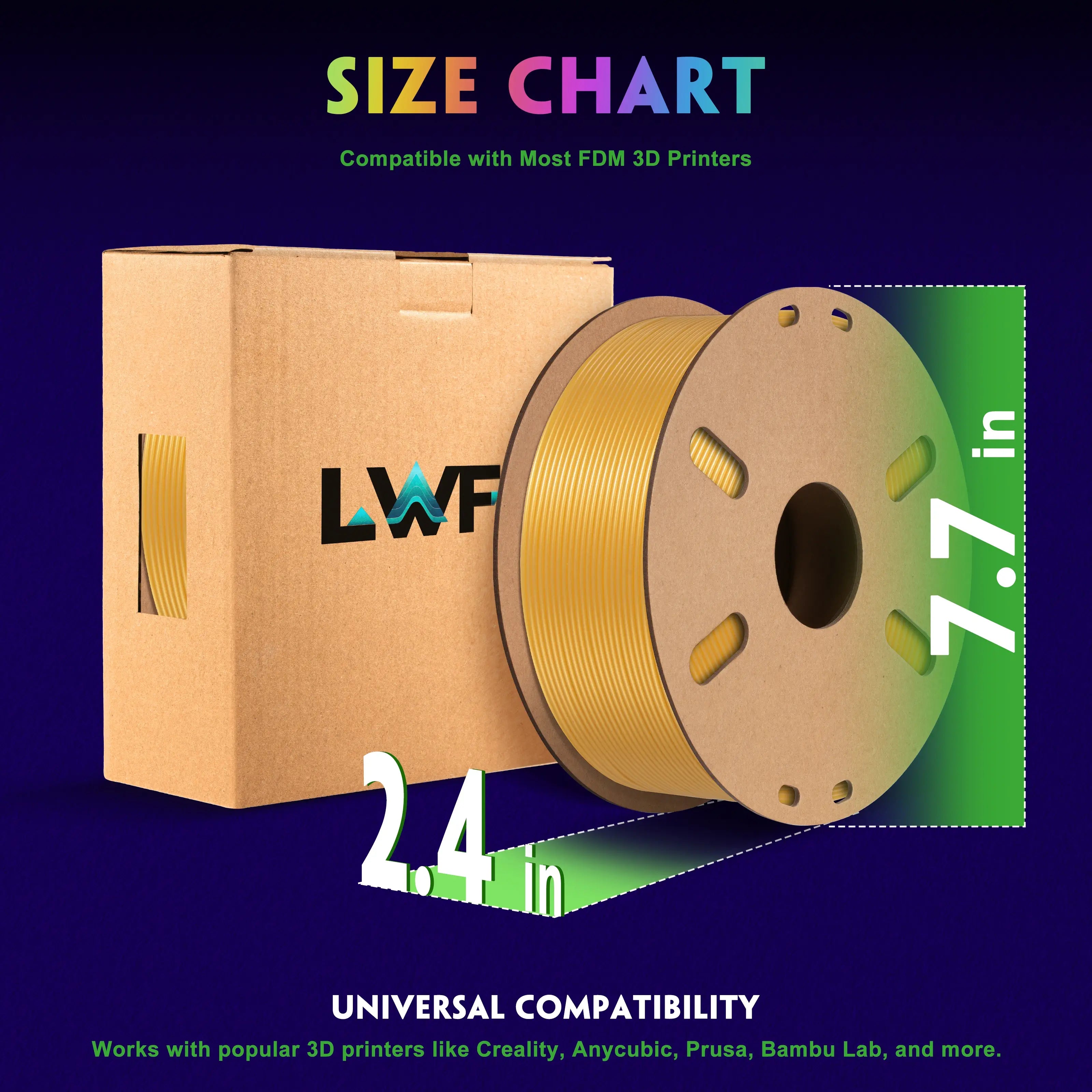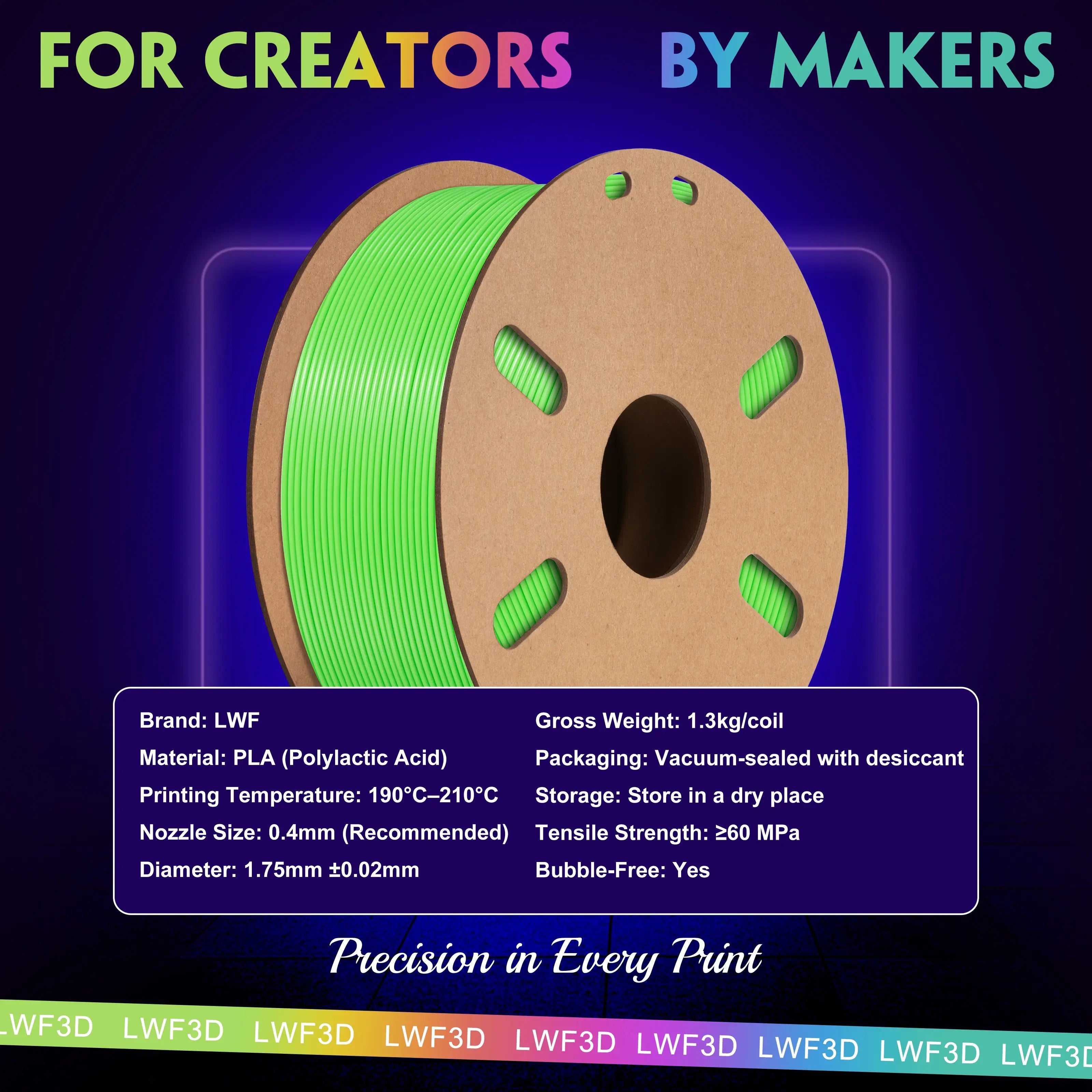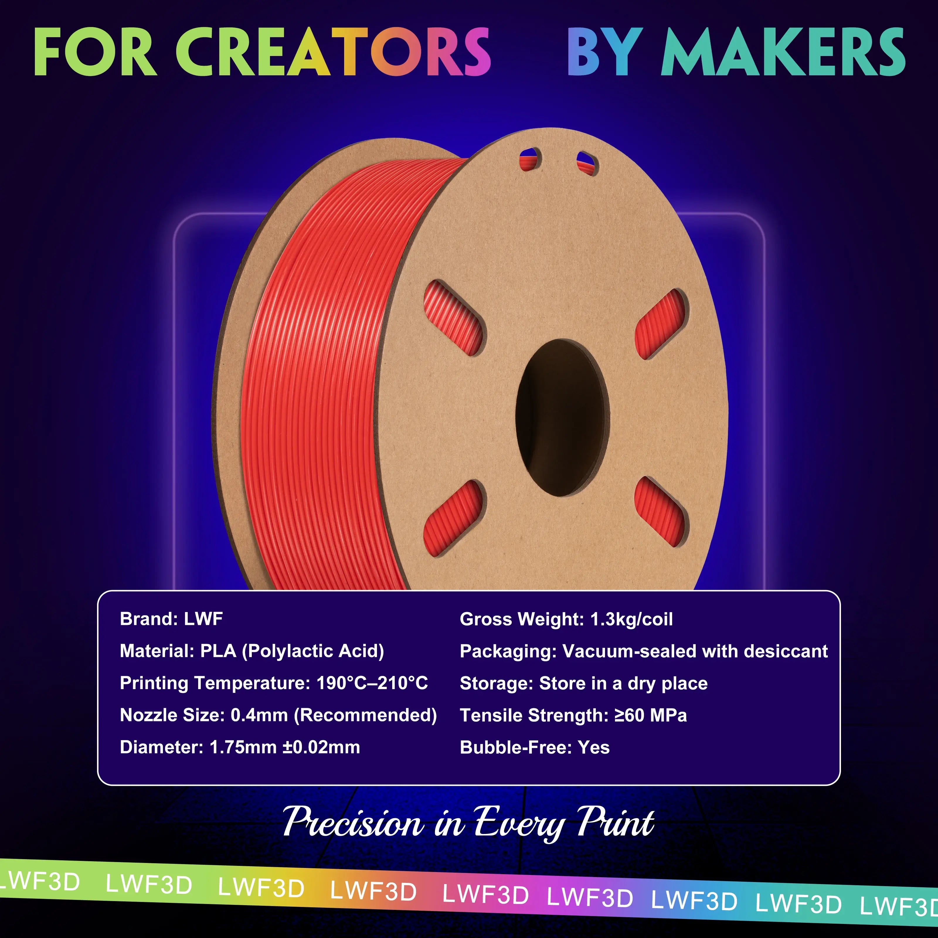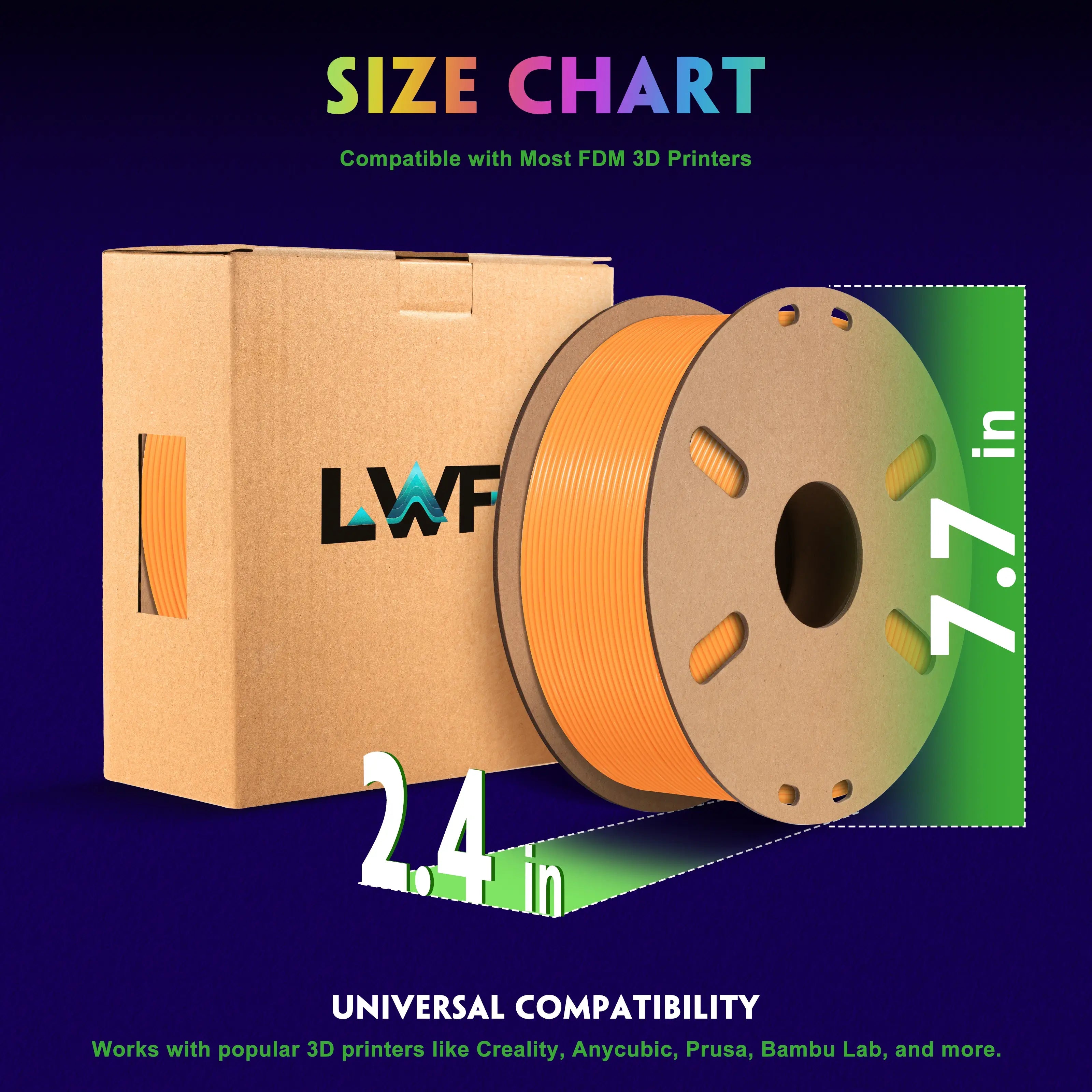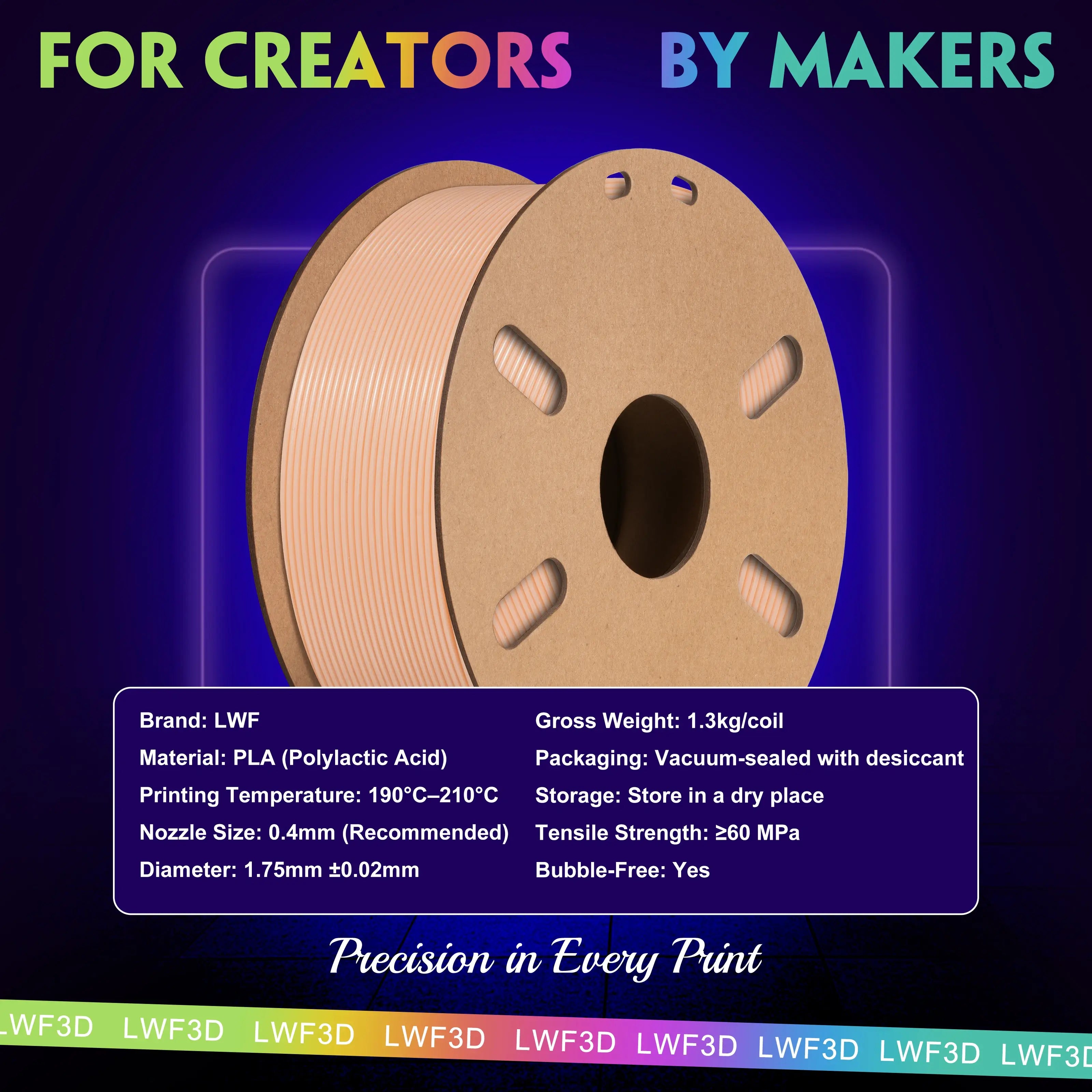 LWF3D printer filament dimensional Accuracy +/- 0.02mm. LWF filament has wide compatibility due to the small diameter error, making it suitable for almost all 1.75mm FDM 3D printers.