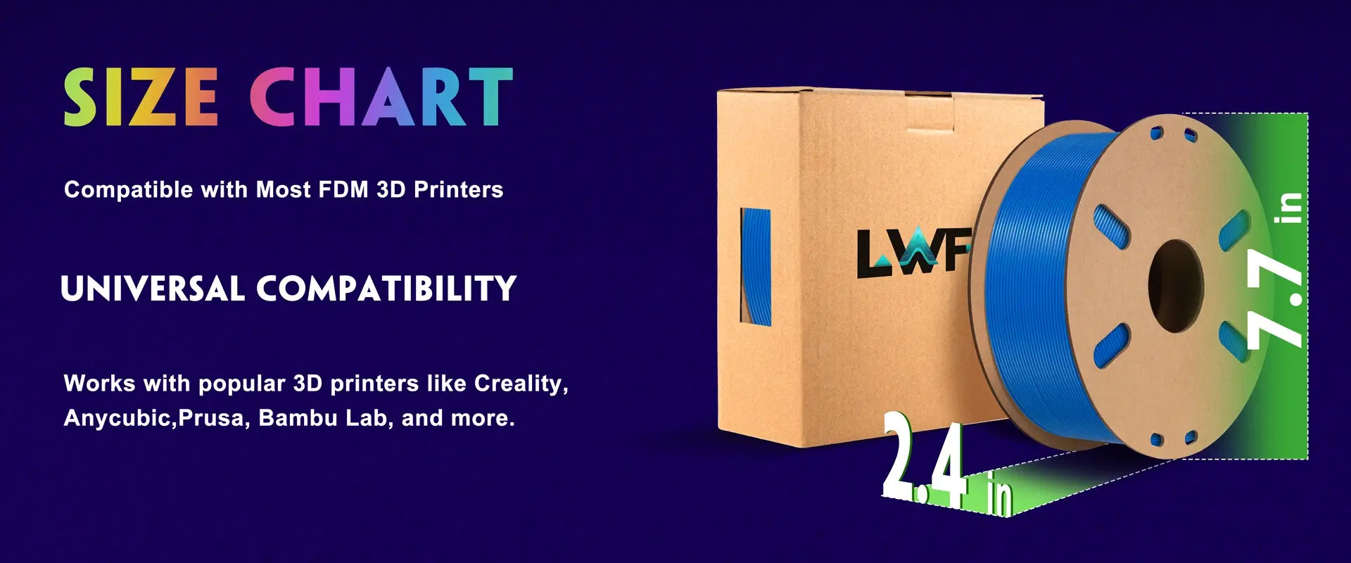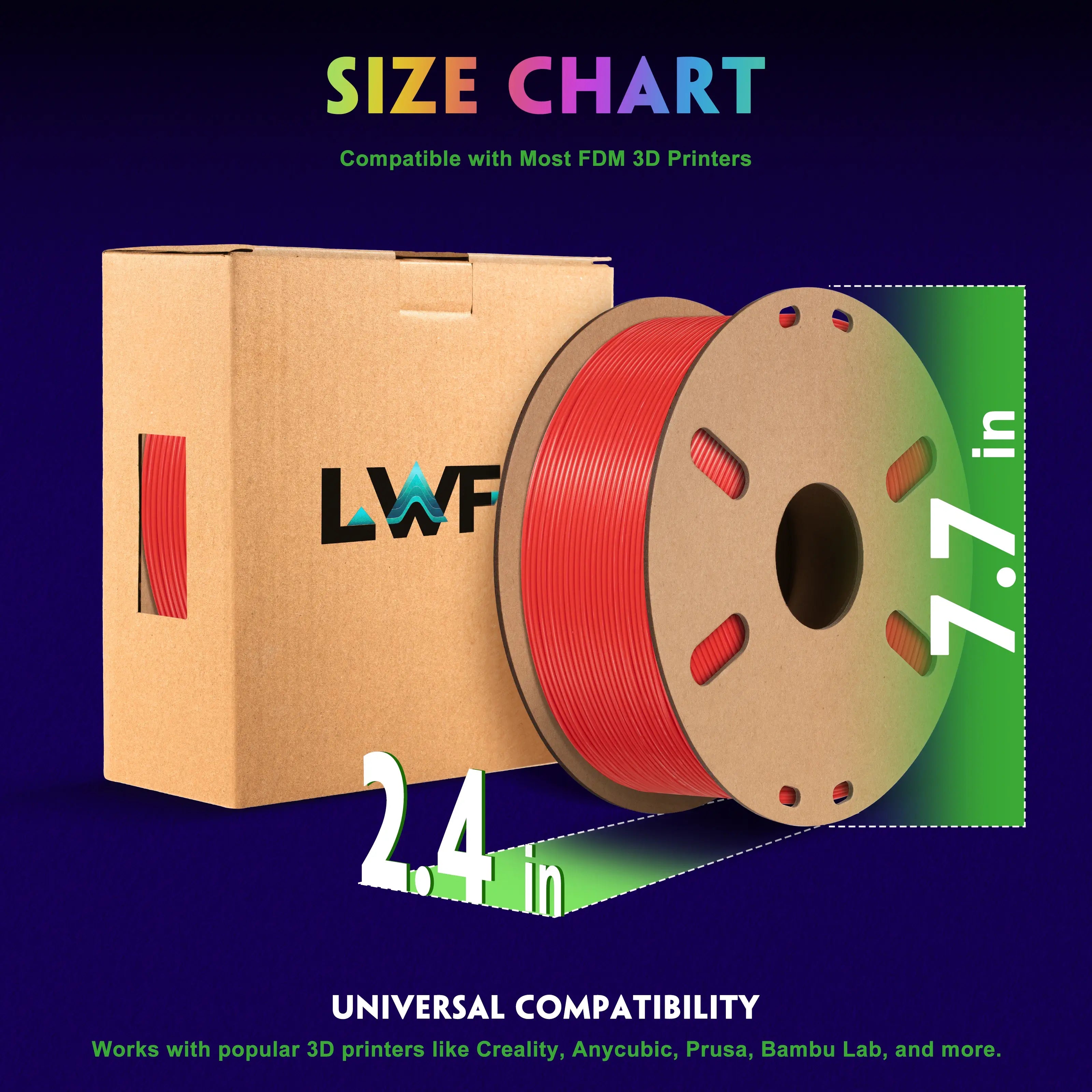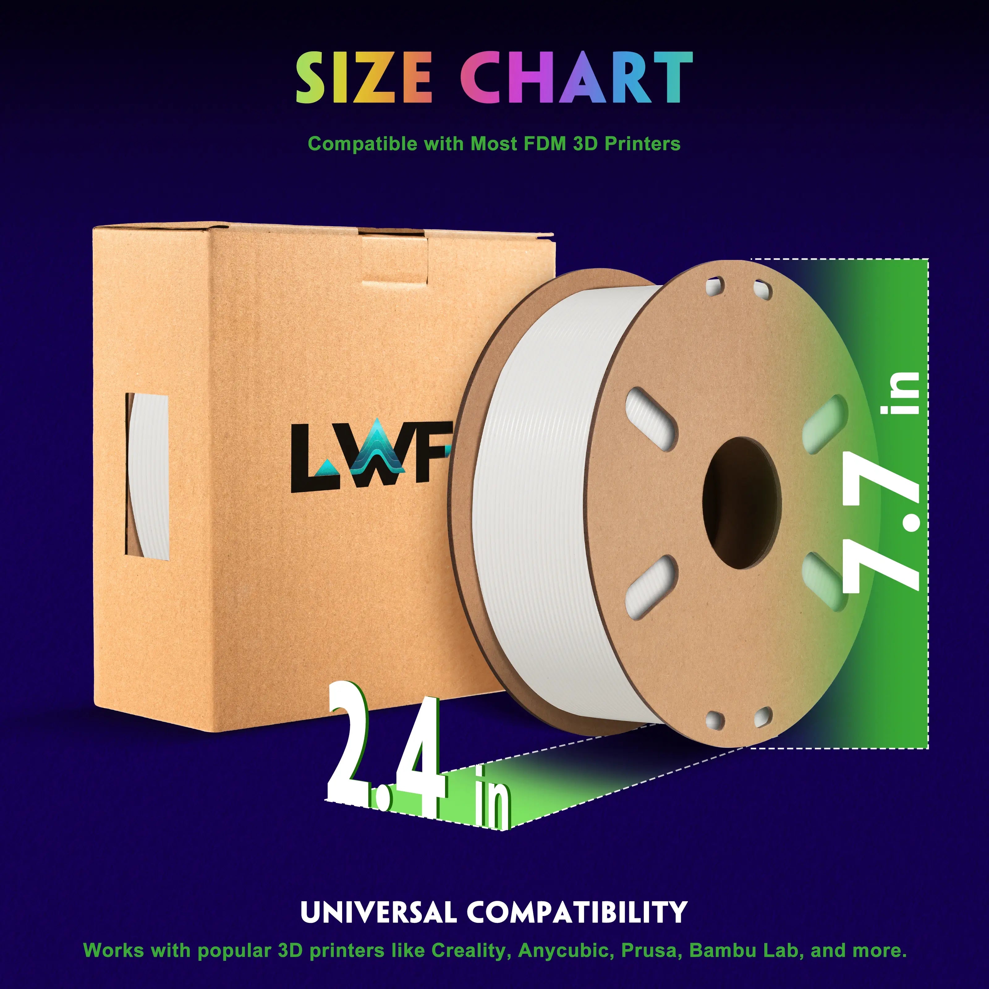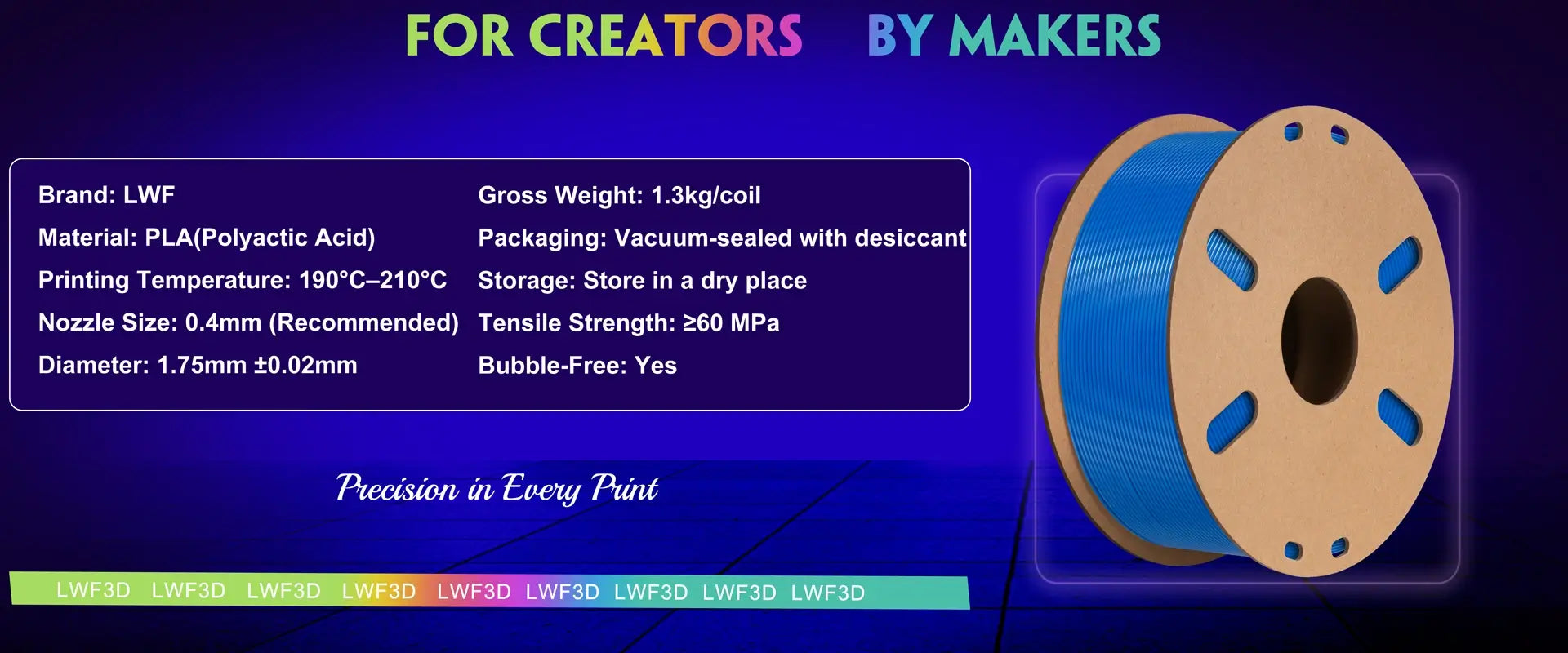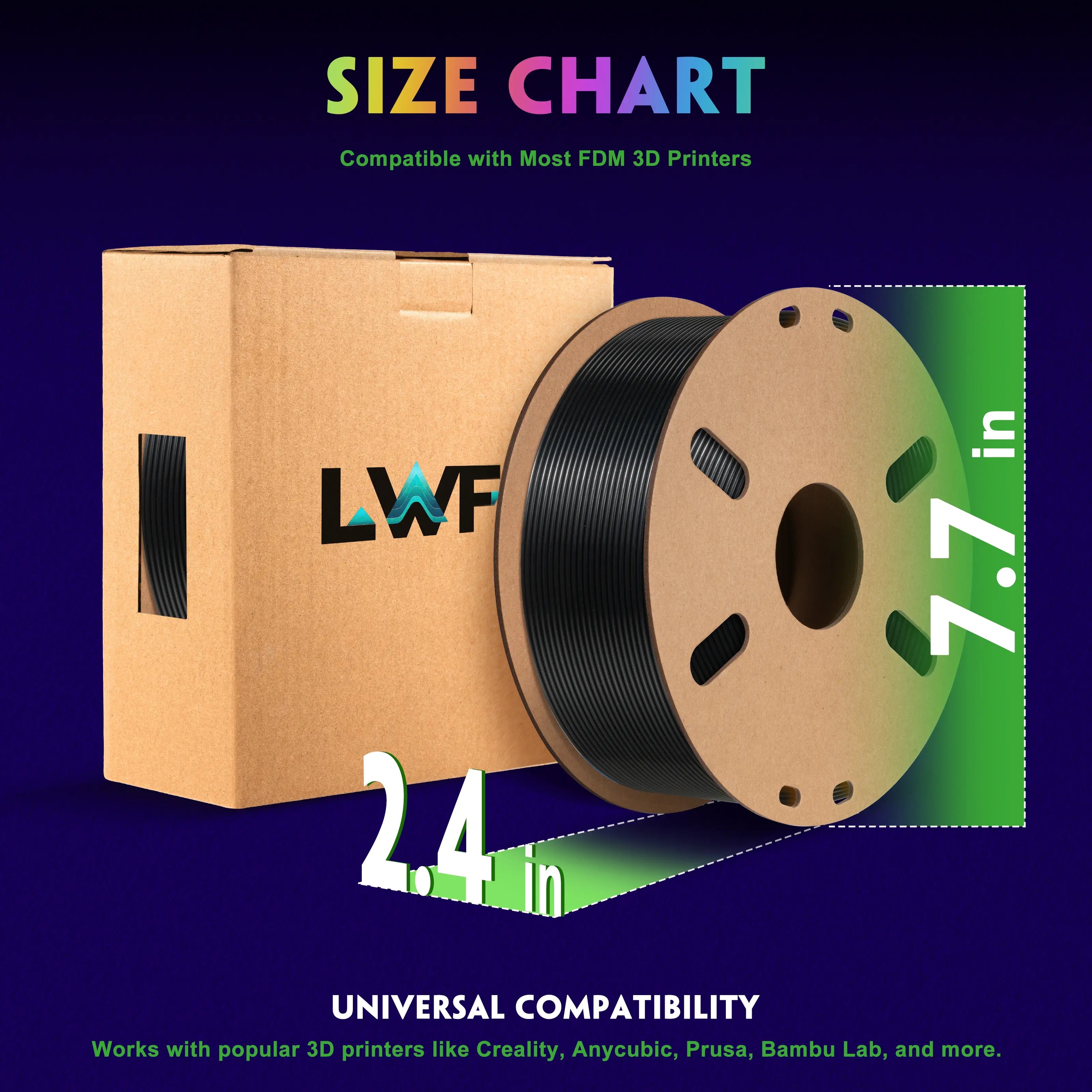 LWF3D printer filament dimensional Accuracy +/- 0.02mm. LWF filament has wide compatibility due to the small diameter error, making it suitable for almost all 1.75mm FDM 3D printers.