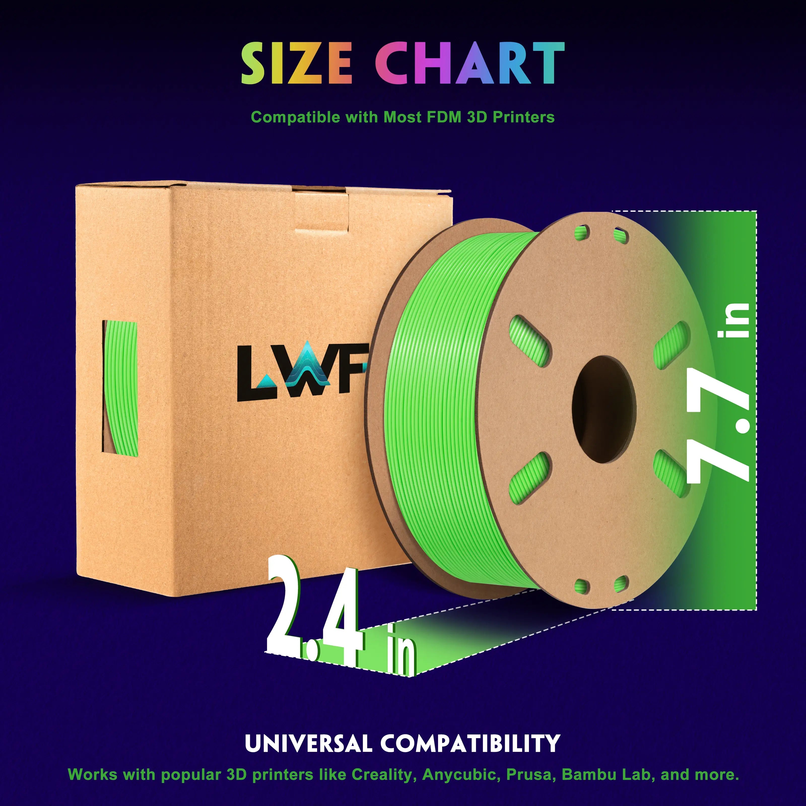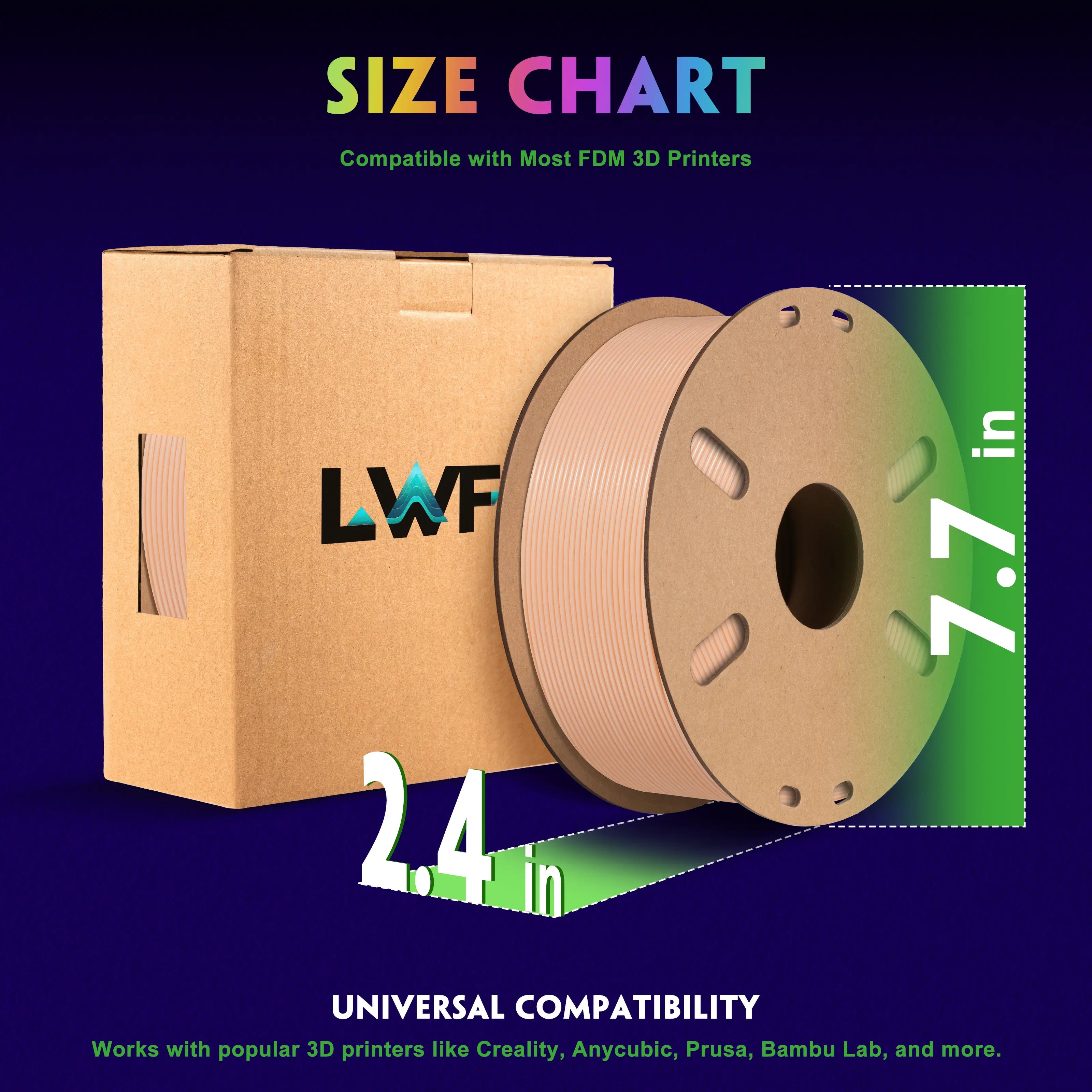 For the best print results with LWF PLA filament, we recommend printing at a nozzle temperature of 190-210°C, a bed temperature of 50-65°C, and a printing speed of 50-100mm/s.